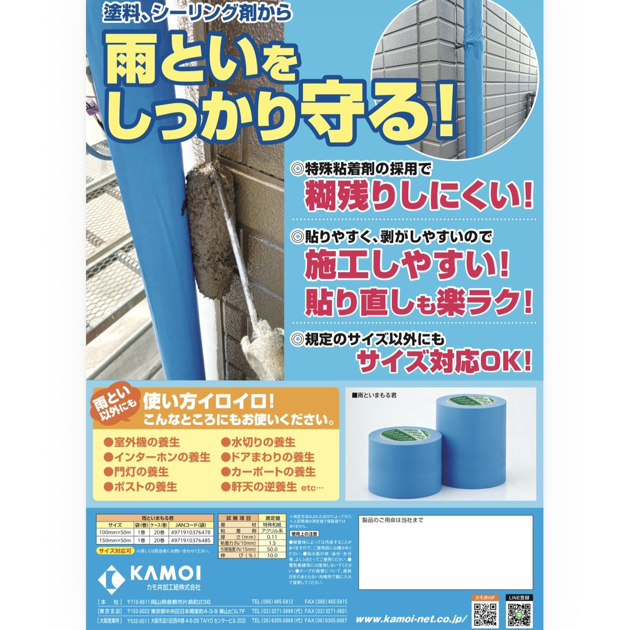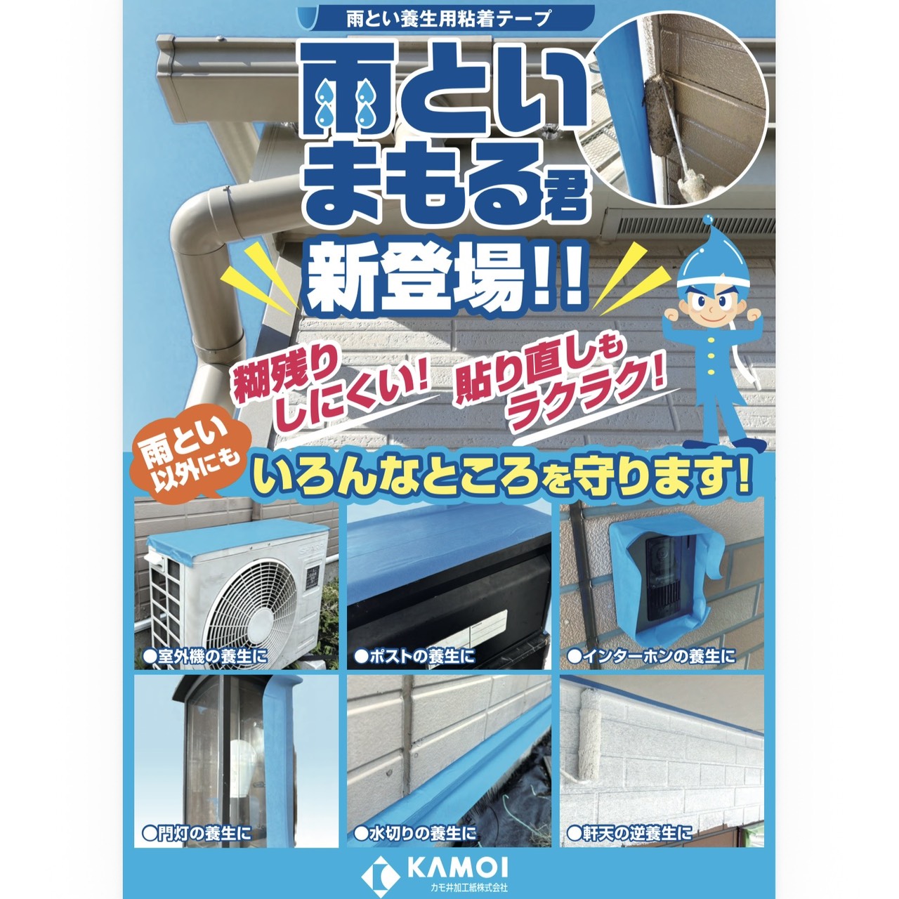 雨とい養生用粘着テープ「雨といまもる君」が新登場! 特殊粘着剤を採用しているため、長期間貼っても糊残りしにくく、作業後もきれいにはがせます。 さらに、貼りやすく剥がしやすい特殊和紙素材を使用しているので、ストレスなく作業ができます。 雨とい以外にも室外機、ポストなど糊残りしやすい箇所の養生にも最適で。屋外作業を快適にサポートします。 サイズ 100mm×50m 150mm×50m 在庫状態 : 入荷待ち ¥1,800(税込) 只今お取扱い出来ません 数量